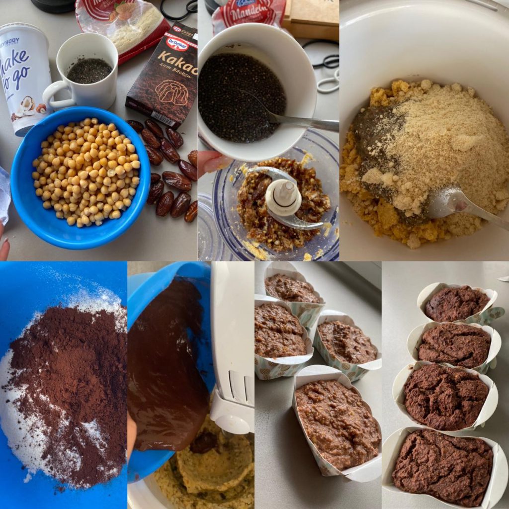 Die Chia-Masse zu den Kichererbsen geben und alles gut vermischen. Gemahlene Mandeln dazugeben, noch einmal gut vermischen. Eiweißpulver mit Kakao vermischen, dazu 200 ml Wasser geben und gut schlagen.